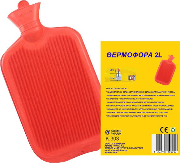 Η θερμοφόρα νερού είναι κατάλληλη και ιδανική να καταπραΰνει τον πόνο με φυσικό τρόπο, είναι κατασκευασμένη από φυσικό εκχύλισμα καουτσούκ (λάτεξ) και ανατομικά σχεδιασμένη με λεπτές και πυκνές ραβδώσεις. Διαθέτει βαλβίδα ασφαλείας ειδικού τύπου από Teflon, παρέχοντας και εξασφαλίζοντας απόλυτη στεγανότητα χωρίς καμία απολύτως διαρροή.